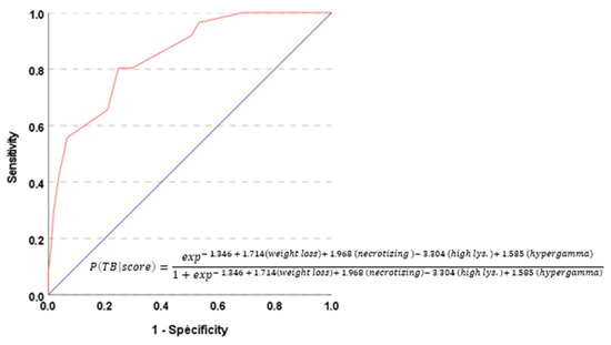 ROC curve assessing the performance of the risk score of tuberculosis. The calculation of the probability of having a diagnosis of tuberculosis based on the score value is represented with the equation of the multivariate logistic regression. A performance analysis revealed an area under the curve (AUC) of 0.85 (95% CI: 0.79–0.91). TB: tuberculosis; necrotizing refers to the variable [presence of necrotizing granuloma]; high lys: high value of lysozyme; hypergamma: hypergammaglobulinemia.
