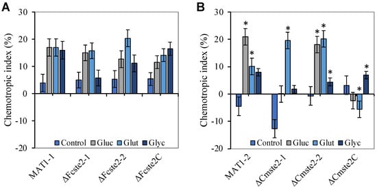 Chemotropic index values obtained for Fusarium circinatum in the presence of glucose (Gluc), glycerol (Glyc), and glutamate (Glut). Graphs indicate the directed hyphal growth of the MAT1-1 (A) and MAT1-2 (B) wild-type strains and their respective ste2 deletion mutant strains (ΔFcste2-1 and ΔFcste2-2, as well as ΔCmste2-1 and ΔCmste2-2) and complementation mutant strains (ΔFcste2C and ΔCmste2C) towards the different compounds, compared to the control (sterile water) after 14 h of exposure. Means that differed significantly (p < 0.05) from those obtained for the control treatment are indicated with asterisks (*). Data represent the average from at least two experiments. n = 250 germ tubes. Error bars represent standard deviation.