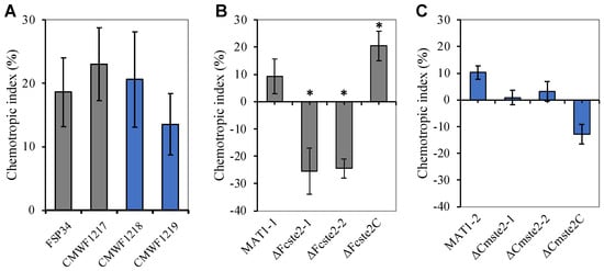 Chemotropic index values obtained for F. circinatum in the presence of synthetic α-pheromone peptide. (A) Chemotropic responses of two wild-type isolates carrying the MAT1-1 mating-type (i.e., FSP34 and CMWF1217) and two with the MAT1-2 mating-type (i.e., CMWF1218 and CMWF1219). (B) Chemotropic responses for the FSP34 MAT1-1 wild type and its corresponding ste2 deletion mutants (ΔFcste2-1 and ΔFcste2-2) and complementation mutant (ΔFcste2C). (C) Responses for the CMWF1218 MAT1-2 wild type and its respective mutants (ΔCmste2-1, ΔCmste2-2 and ΔCmste2C). Means that differed significantly (p < 0.05) from those obtained from the respective wild-type strains are indicated with asterisks (*), while data represent the average of at least ten replicates. n = 250 germ tubes. Error bars represent standard deviation.