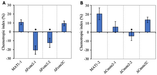 Both wild-type strains used in this study showed positive chemotropism towards pine root exudate (Figure 3). However, deletion of ste2 from the MAT1-1 wild type yielded significantly (p < 0.05) reduced chemotropic index values, although the values obtained for the corresponding complementation mutant did not differ significantly from those of the wild type (Figure 3A). Likewise, the deletion of ste2 from the MAT1-2 wild type negatively impacted the chemotropic response towards root exudate in the two mutants, and not in the complementation mutant ∆Cmste2C (Figure 3B).