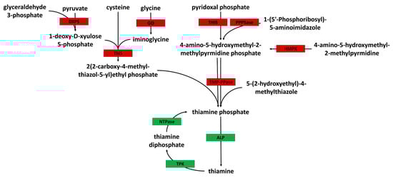 - Du, Q.; Wang, H.; Xie, J. Thiamin (Vitamin B1) Biosynthesis and Regulation: A Rich Source of Antimicrobial Drug Targets? Int. J. Biol. Sci. 2011, 7, 41–52. [Google Scholar] [CrossRef] [PubMed]