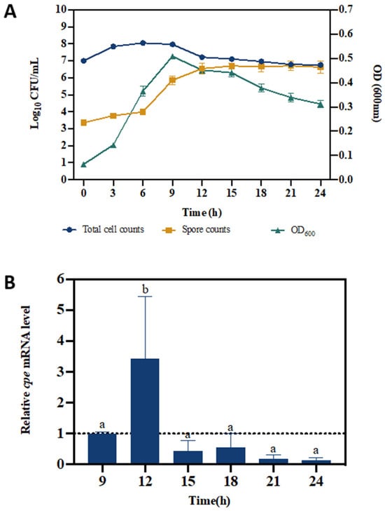 Growth, sporulation, and cpe expression of C. perfringens in modified Duncan Strong medium. (A) Total C. perfringens cell counts, spore counts, and OD600 measurements. (B) Relative cpe mRNA levels of C. perfringens during incubation in modified Duncan Strong medium. The expression level at 9 h was set at 1 and the levels at the other time points were normalized accordingly using the 2−ΔΔCT method. The gapdh gene was used as the reference gene. The error bars represent the standard deviations of 3 biological replicates. Different letters indicate significant differences in cpe mRNA levels (one-way ANOVA, followed by Dunnett’s post hoc test; p < 0.05).