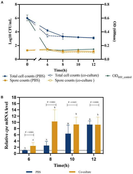 Survival, sporulation, and cpe expression of C. perfringens in co-culture with Caco-2 cells compared to the PBS control treatment. (A) Total C. perfringens cell counts, spore counts and OD600 over time. (B) Relative cpe mRNA levels of C. perfringens with/without Caco-2 cells. The expression level in the PBS treatment after 6 h was set at 1, and the expression levels for all treatments at the other time points were normalized accordingly using the 2−ΔΔCT method. The gapdh gene was used as the reference gene. The initial ratio C. perfringens: Caco-2 cells in the co-culture was 100:1 (MOI = 100). Experiments were conducted in three biological replicates and the error bars present the standard deviations. Different letters (capitals for the PBS treatment; small letters for the co-culture) indicate significant differences in cpe mRNA levels at different time points within each treatment (Two-way ANOVA, followed by Tukey’s post hoc test; p < 0.05). p values for the comparison between PBS and co-culture at each time point are also indicated.