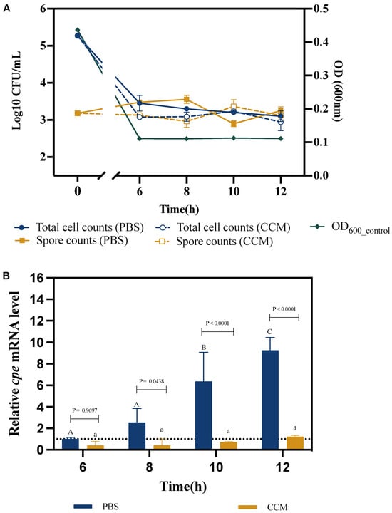 Survival, sporulation, and cpe expression of C. perfringens in Caco-2 cell supernatants (CCM) compared to the PBS control treatment. (A) Total C. perfringens cell counts, spore counts and OD600 over time. (B) Relative cpe mRNA levels. The expression level in the PBS treatment after 6 h was set at 1, and the expression levels for all treatments at the other time points were normalized accordingly using the 2−ΔΔCT method. The gapdh gene was used as the reference gene. Experiments were done in three biological replicates and the error bars present the standard deviations. Different letters (capitals for the PBS treatment; small letters for the co-culture) indicate significant differences in cpe mRNA levels at different time points within each treatment (Two-way ANOVA, followed by Tukey’s post hoc test; p < 0.05). p values for the comparison between PBS and co-culture at each time point are also indicated.