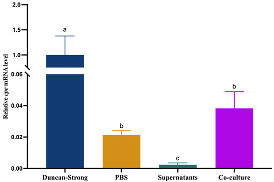Relative cpe mRNA level of C. perfringens in different media (modified Duncan Strong medium, PBS, Caco-2 cell supernatants, and co-culture with Caco-2 cells) after 12 h of incubation. The initial ratio C. perfringens: Caco-2 cells in the co-culture was 100:1 (MOI = 100). The expression level in the modified Duncan Strong medium was set at 1 and the levels in the other treatments were normalized accordingly using the 2−ΔΔCT method. The gapdh gene was used as the reference gene. Experiments were conducted with at least two biological replicates and the error bars represent standard deviations. Different letters indicate significant differences in cpe mRNA levels between treatments (Two-way ANOVA, followed by Tukey’s post hoc test; p < 0.05).