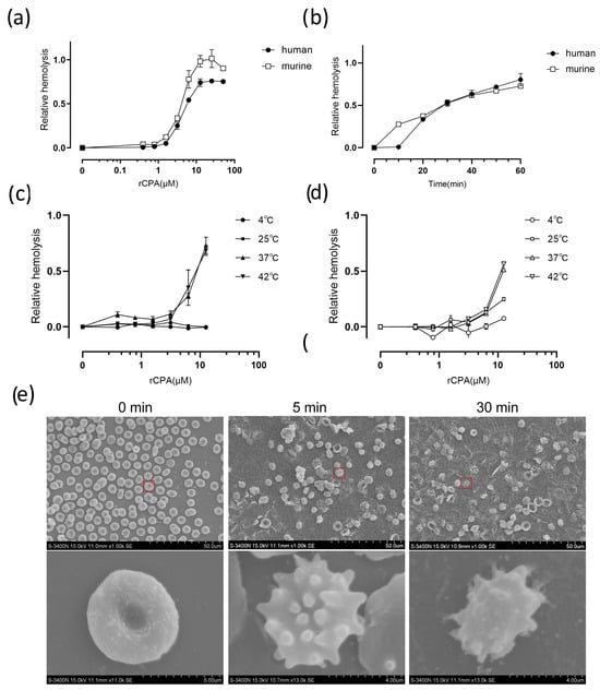 Temperature also played an important role in rCPA-induced hemolysis of human and murine erythrocytes (Figure 1c,d). Hemolysis was inhibited when cells were incubated at 4 °C or 25 °C. There was little difference in the degree of hemolysis at 42 °C compared to 37 °C, so 37 °C was chosen as the temperature used in subsequent experiments. The concentration of rCPA required for 50% hemolysis (HC50) after 60 min incubation at 37 °C was 4.6 μM. In all subsequent experiments, 4.6 μM of rCPA was therefore used.