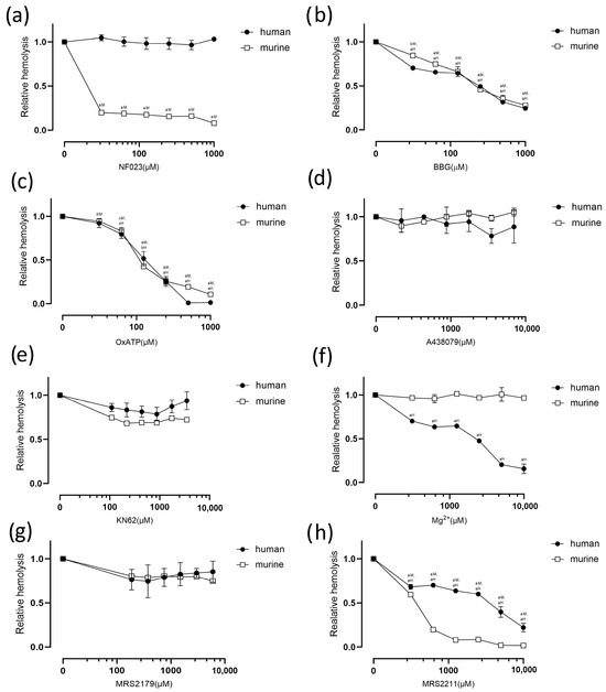 P2X1- and P2X7-selective antagonists, Brilliant Blue G (BBG) and ATP-2′, 3′-dialdehyde (OxATP), significantly reduced hemolysis in a concentration-dependent manner (Figure 3b,c). To our surprise, by contrast to BBG and OxATP, the P2X7-selective antagonists A438079 and KN-62 only had a slight effect on the hemolysis of human and murine erythrocytes (Figure 3d,e).