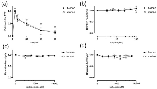 Relationship between rCPA-induced hemolysis of human and murine erythrocytes and extracellular ATP. (a) Adding rCPA (4.6 μM) to erythrocytes caused a rapid increase in extracellular ATP content from 0 to 5 min, and then a time-dependent decrease. The ATP value corresponding to 5 min is defined as 1. (b) The relative hemolysis of human erythrocytes incubated with increasing concentrations of the ATP-scavenging enzyme apyrase. Erythrocytes were incubated with rCPA (4.6 μM) and (c) carbenoxolone or (d) mefloquine for 60 min at 37 °C. Values are the mean ± SD (n = 3). The hemolysis value corresponding to 0 μM of each antagonist and 4.6 μM rCPA was defined as 1. The statistical differences between each concentration of the inhibitor group and normal hemolysis group without inhibitor are indicated by letters b, c, and d, respectively, where “b” denotes p < 0.001, “c” denotes p < 0.01, “d” denotes p < 0.05, H denotes human red blood cells, and M denotes mouse red blood cells.