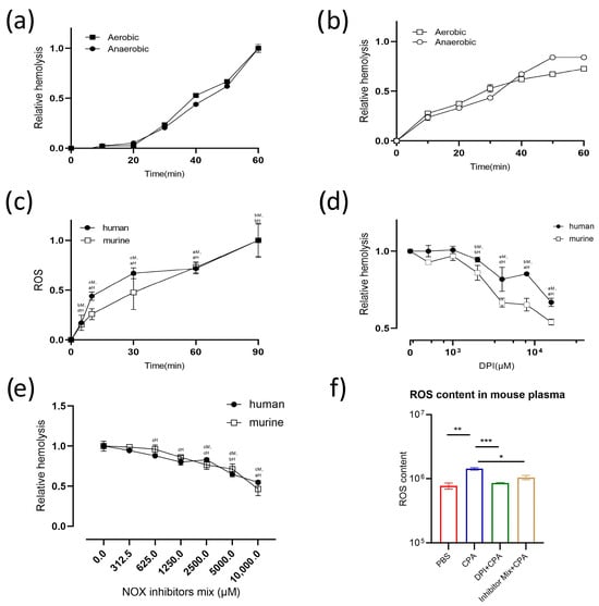 The effect of oxygen on rCPA-induced hemolysis. (a) Extracellular O2 has no effect on the rCPA-induced hemolysis of human and (b) murine erythrocytes. The rCPA concentration used was 4.6 μM. (c) Detection of extracellular ROS at different times of rCPA-induced hemolysis in human and murine erythrocytes. The rCPA concentration used was 4.6 μM. (d) DPI, an inhibitor of NADPH oxidase, can significantly inhibit the rCPA-induced hemolysis of human and murine erythrocytes. The hemolysis value corresponding to 0 μM of DPI and 4.6 μM rCPA was defined as 1. (e) Hemolysis of murine and human erythrocytes was inhibited by NOX inhibitors. Values are the mean ± SD (n = 3). The hemolysis value corresponding to 0 μM of inhibitor and 4.6 μM rCPA was defined as 1. The statistical differences between each concentration of the inhibitor group and normal hemolysis group without inhibitor are indicated by letters a, b, c, and d, respectively, where “a” denotes p < 0.0001, “b” denotes p < 0.001, “c” denotes p < 0.01, “d” denotes p < 0.05, H denotes human red blood cells, and M denotes mouse red blood cells. (f) NADPH oxidase inhibitors caused a decrease in ROS content in the plasma of mice. Among them, PBS was used as a negative control and rCPA as a positive control. The ROS content in the plasma of mice treated with rCPA (590 μg/kg) for 1 h was significantly increased. The ROS content in the plasma of mice pretreated with DPI (2 mg/kg/d, treatment for 3 days) and NOX inhibitor mix (20 mg/kg/d, treatment for 3 days) was significantly lower than that of the rCPA group. Values are means ± standard deviation. * p < 0.05, ** p < 0.01, *** p < 0.001 compared with CPA-treated positive controls.
