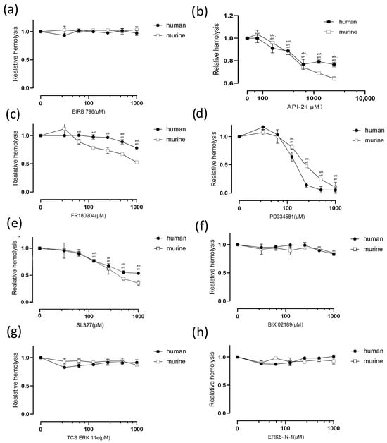 Effects of different pathway inhibitors on the rCPA-induced hemolysis of human and murine erythrocytes. (a) The degree of hemolysis did not change with increasing concentrations of the p38 MAPK inhibitor BIRB 796, implying no involvement in rCPA-induced hemolysis, in contrast to (b) the Akt inhibitor API-2, which can significantly inhibit rCPA-induced hemolysis. Regarding the MEK/ERK pathway, (c) the ERK inhibitor FR180204 slightly inhibits rCPA-induced hemolysis, (d) the MEK1 inhibitor PD334581 and (e) MEK1/2 inhibitor SL327 significantly inhibit rCPA-induced hemolysis, in contrast to (f) the MEK5/ERK5 inhibitor BIX02189, (g) ERK2 inhibitor TCS ERK 11e, and (h) ERK5 inhibitor ERK5-IN-1. Values are the mean ± SD (n = 3). The hemolysis value corresponding to 0 μM of each antagonist and 4.6 μM rCPA was defined as 1. The statistical differences between each concentration of the inhibitor group and normal hemolysis group without inhibitor are indicated by letters a, b, c, and d, respectively, where “a” denotes p < 0.0001, “b” denotes p < 0.001, “c” denotes p < 0.01, “d” denotes p < 0.05, H denotes human red blood cells, and M denotes mouse red blood cells.