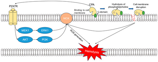 In conclusion, we confirmed that rCPA-induced hemolysis in erythrocytes is related to the activation of P2 receptors, especially P2X1 and P2X7. Moreover, we found that the activation of P2 receptors led to the activation of NADPH oxidase through the MEK1/ERK1 and PI3K/Akt pathways and that the increased production of ROS eventually causes the lysis of erythrocytes. The mechanism by which rCPA activates P2 receptors and the relation between the activation of P2 receptors and the production of ROS were preliminarily revealed. In addition to this, it has been previously shown that CPA can directly bind to target cell membranes through the C-domain, leading to the toxin-dependent hydrolysis of phosphatidylcholine in liposomes [53]. Therefore, we speculate that this may also be one of the causes of red blood cell damage (Figure 8). We also demonstrate the presence of a common signaling pathway between pore-forming and non-pore-forming toxin-induced hemolysis, in which P2 receptors may play a key role, and that the production of ROS is most likely the main cause of hemolysis. These findings help to clarify the mechanism of action of rCPA and other hemolysins and also provide insight into potential candidate drugs for the treatment of rCPA-induced diseases.