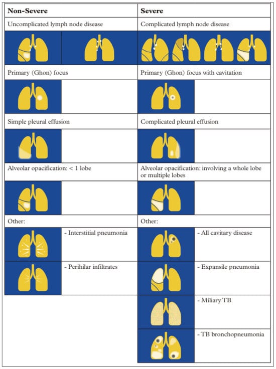Determining the severity of TB disease on CXR allows for identification of patients who are at increased risk for poor outcomes and may require admission or referral to higher levels of care. In addition, severity of disease may determine a patient’s eligibility for new, short-course treatment regimens. In 2022, WHO recommended a shorter treatment regimen of four months for children with non-severe TB disease [14,39] (see below, Section 4). CXR plays a central role in determining eligibility for these shorter regimens in settings where CXR is available. The Union Atlas provides an overview of the features characteristic of non-severe and severe PTB in children (Figure 3) [97]. In general, the presence of airway compression, cavitation, miliary patterns, or more diffuse lung involvement indicates more severe TB disease.