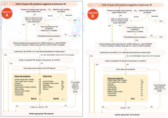The disproportionate TB burden in this age group is due to unique vulnerabilities, varying clinical presentations, and challenges in screening for, diagnosing, treating, and preventing TB in children. A schematic of the pathway through TB exposure, infection, and disease in children and potential areas of challenge where children are lost along the clinical care cascade is included in the World Health Organization’s (WHO’s) Roadmap to ending TB in children and adolescents [13]. For instance, children with TB often present with non-specific clinical signs and symptoms resembling common childhood illnesses, seek care at health clinics or departments that do not routinely screen to identify presumptive TB, and/or do not have access to recommended diagnostic tests and radiography services to evaluate those identified with presumptive TB. Additionally, young children are more likely to have extrapulmonary TB (EPTB), which further increases variability in their clinical presentation. These challenges may hinder the appropriate evaluation of children for TB disease [6,14,15,16]. Children have difficulty providing high-quality, spontaneously expectorated sputum for diagnostic testing, especially young children, and often require more invasive sampling procedures such as sputum induction or gastric aspiration [6,14,17,18]. Consequently, increased use of less invasive specimens (e.g., stool, urine, nasopharyngeal aspirates (NPA)) is now recommended. However, these specimen types often have fewer mycobacteria, resulting in decreased test sensitivities for young children [19,20]. Clinical diagnosis based on signs, symptoms, patient history, and radiography therefore remains critically important for identifying TB in children [18,21]. Furthermore, clinicians often need to use every piece of information available to guide a clinical decision on TB treatment for pediatric patients with presumed TB but with negative diagnostic test results (see Treatment Decision Algorithms below).