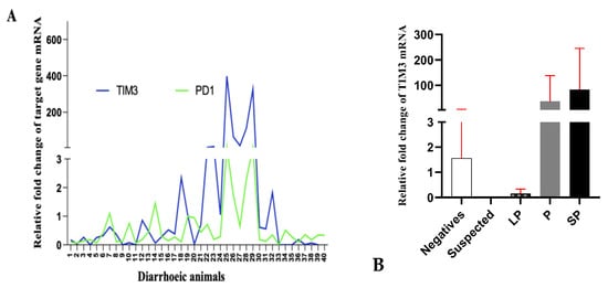 TIM-3 is expressed by effector T cells, and PD-1 is expressed by various immune cells that include lymphocytes, myeloid cells and macrophages. PD-1 expression was evaluated on PBMCs harvested from the above-mentioned 40 animals. Standardisations for evaluating expression of PD-1 on buffalo PBMCs were done using both the set of published primers as well as the set of self-designed primers (Supplementary Tables S4 and S5). qRT-PCR was performed (as discussed in the materials and methods section), and we could detect PD-1 expression on the PBMCs from healthy as well as diarrhoeic animals (Figure 2B). As shown in Figure 2B, relatively higher expression levels of PD-1, i.e., around 7-fold, 1.75-fold, 2.5-fold, and 7.6-fold higher, were recorded in 4 chronically diarrhoeic animals (animal numbers 25, 26, 28 and 29) were MAP-seropositive, compared to healthy controls (animal numbers 17–24) and the expression was higher than other diarrhoeic animals that were MAP-seronegative animals that reported to clinics for therapeutic management of diarrhoea. Interestingly, relatively higher PD-1 levels were recorded in those 4 animals that had also exhibited relatively high levels of TIM-3 expression, suggesting a state of high TIM-3 and PD-1 co-expression on the PBMC fraction of these animals. TIM-3 is known to be transiently expressed by T cells after acute infection, whereas high TIM-3 expression is retained throughout chronic infection and high TIM-3 and PD-1 co-expression has been associated with a more severe exhaustion. Thus suggesting a state of exhaustion in chronically diarrhoeic MAP-seropositive animals. Evaluation of the levels of such immuno-inhibitory receptors in chronic infections may help in identifying an ongoing state of immune exhaustion. Furthermore, the levels of PD-1 expression in four high-expressing diarrhoeic buffaloes (animal numbers 25, 26, 28 and 29) were lower compared to the levels of TIM-3 expression in these animals (Figure 3A).