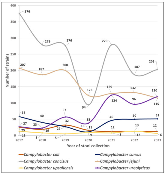 The proportions of Campylobacter isolates from the pre-COVID-19 (2017–2019) and post-COVID-19 (2021–2023) pandemic periods were compared using the Chi-squared test, and continuous data were compared using the non-parametric Mann–Whitney test. A p-value of <0.05 was considered statistically significant.