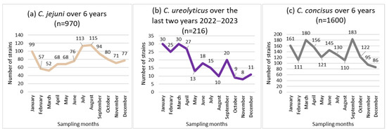 Seasonal distribution of the most prevalent Campylobacter species, i.e., C. jejuni (a), C. concicus (b), and C. ureolyticus (c) in 51,065 stools at the Department of Microbiology, LHUB-ULB, Belgium, from 1 January 2017 to 31 December 2023, excluding year 2020 using Butzler selective medium plus filtration culture, with a 0.6 µm pore size polycarbonate filter and Columbia agar.