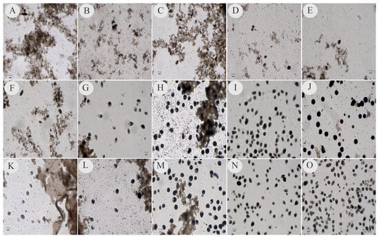 In general, the tubes containing the material inoculated for up to 72 h (3rd day) had many fecal remnants, and debris could be visualized on the microscope slides when checking for isolates. However, the ciliates showed faster movement and more translucent cytoplasmic staining after up to 48 h (2nd day), but especially after 24 h (1st day), of incubation than at the other times (Figure 1A,B,F,G,K,L). From 72 h onwards, the movement speed began to decrease, and the transverse division of the parasitic cells intensified in all media from which the isolates were successfully obtained (Figure 1C,H,M). In the subsequent subcultures at 96 and 120 h (4th and 5th days), the ciliate forms were rounder, larger, darker, and less motile than they were at the initial times, and little evidence of fecal material was observed on the microscope slides (Figure 1D,E,I,J,N,O). During these periods, large numbers of parasites were observed on microscope slides during the observations and production of subcultures, mainly in PB and PH (Figure 1I,J,N). The evolutionary forms of other microorganisms, such as bacteria, parabasilids and Blastocystis sp., were also visualized during the observations.