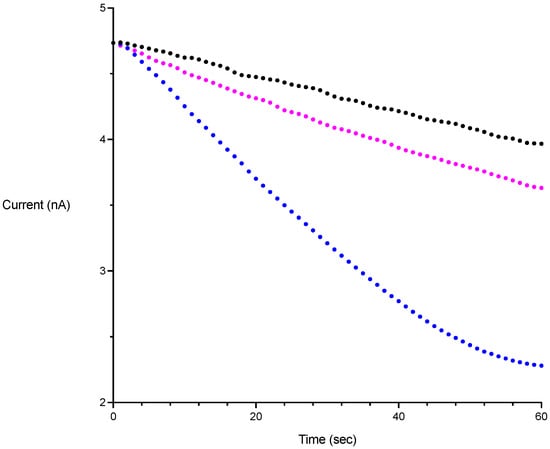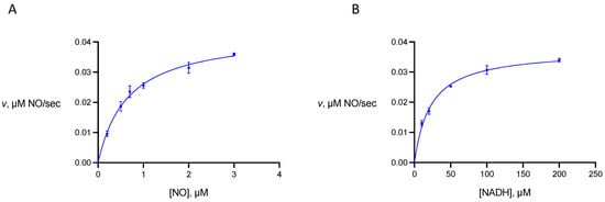 To determine NOD activity, Michaelis constant, and enzyme inhibition, rate assays were performed on a World Precision Instruments free radical analyzer (WPI, Sarasota, FL, USA) equipped with an NO-sensitive electrode and a temperature probe, connected to an analog digital converter controlled by Labscribe software, version 4 (iWorx, Dover, NH, USA). Before each set of experiments, the instrument was calibrated by adding aliquots of a 10.0 mM sodium nitrite standard ((MilliporeSigma, Oakville, ON, Canada) to a solution of 0.1 M KI in 0.1 M H2SO4, and measuring the current response, according to the manufacturer’s instructions. A linear response was observed with slopes of 2.3 to 2.8 nA/μM NO.