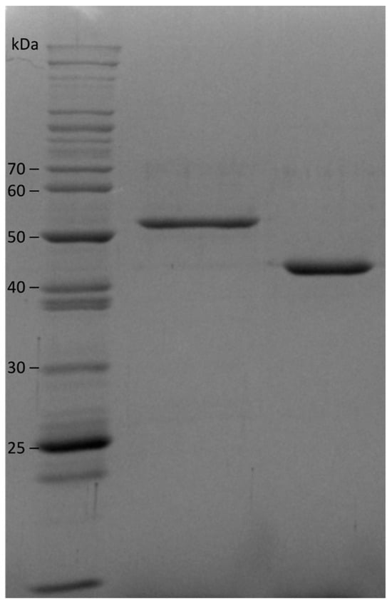 SDS-PAGE of purified recombinant flavohemoglobins. Lane 1, size ladder. Lane 2, Giardia flavohemoglobin gFlHb (54.4 kDa). Lane 3, E. coli Hmp (46.3 kDa).