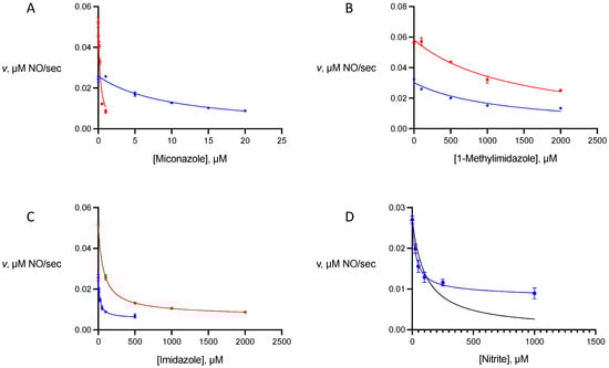 Plots of nitric oxide dioxygenase inhibition data. In all panels, data for gFlHb is denoted by the blue traces and Hmp by the red traces. Lines of best fit for miconazole (A) and 1-methylimidazole (B) were calculated by nonlinear regression for monophasic non-competitive inhibition. Values for imidazole (C) and nitrite (D) were calculated by nonlinear regression for biphasic non-competitive inhibition. For comparison, the black trace in (D) corresponds to a fit of the data to monophasic inhibition. Hmp nitric oxide dioxygenase activity is not significantly affected by nitrite and is not included.