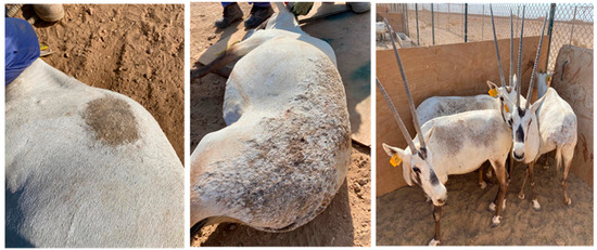 - Thrivikraman, A.; Wernery, U.; Baskar, V.; Almheiri, F.G.; Schuster, R.K. An Outbreak of Sarcoptic Mange in Free-Ranging Arabian Oryx (Oryx leucoryx) in the United Arab Emirates, and Treatment with Ivermectin-Medicated Pelleted Feed. J. Wildl. Dis. 2023, 59, 791–795. [Google Scholar] [CrossRef]