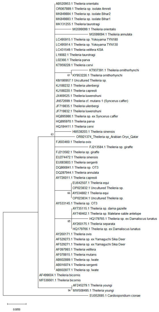 Since the 18S RNA is a highly conserved gene which enables subsequent genetic diversity analysis [27], we used the generated sequences to explore our isolate’s phylogenetic position within 64 Theileria sp. retrieved from the GenBank database. Our oryx isolate did not cluster with previously reported sequences from different antelope species, such as the African (Accession numbers: HQ179766.1; HQ179765.1) and Sable (Accession number: AY748462.1) antelopes, but bunched distinctly on a separate phylogenetic tree branch (63%). It is worth noting that our isolate sequence did not bundle with the common Theileria species reported previously within herbivore animals identified from the MENA region (Accession numbers: AY735115; LC431549) but were surrounded by Theileria species identified from China (HM538203.1; FJ603460.1) (Figure 3).