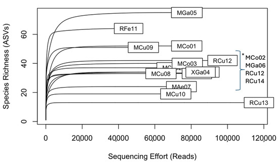 Rarefaction curves for vertebrate species identified from mosquito blood meals collected at Rabuor and Mamboleo, Kisumu. The x-axis is sequencing effort, and the y-axis is species richness. The tips of each curve are labeled with the mosquito pool identity. * Unreadable pool names overlapped.