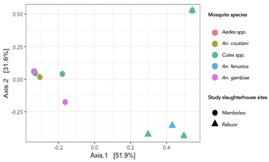 A summary of the relative abundance of vertebrate hosts is presented in Table 4. Overall, a total of 14 vertebrate species were detected and belonged to two classes, i.e., Mammalia (82.3% relative abundance) and Aves (17.7%). Culex spp., by far, had the most diverse vertebrate blood meals (Table 4). However, when non-metric multidimensional scaling plots using Bray–Curtis dissimilarity were visualized, the study site, rather than the mosquito species, was the main driver of observed differences in the data (Figure 2). The study site explained 51.9% of variation in identified vertebrate hosts.