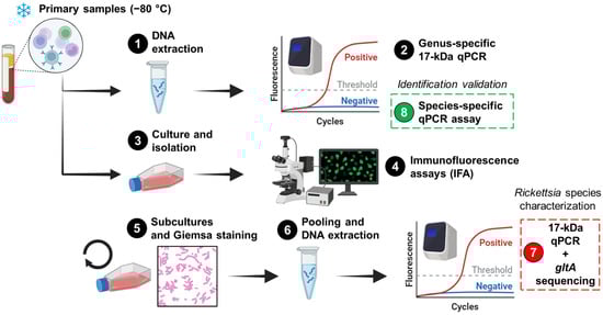 The workflow for the detection and characterization of Rickettsia in cultures and primary samples. The workflow comprises eight steps, starting with human blood leukocytes that were previously stored at −80 °C. The penultimate step (Step 7) involved the characterization of the agent in cultures, while the final step (Step 8) was performed to validate the results in primary samples. The figure was created in https://www.biorender.com/ (Accessed on 2 April 2024).