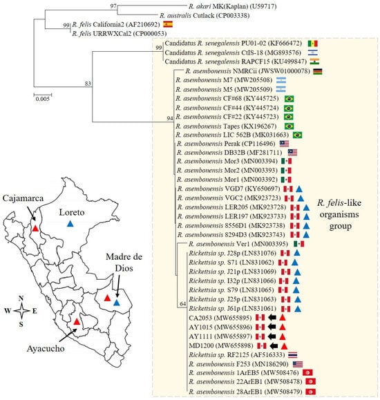 The phylogenetic analysis and detection sites. The analysis was performed including 28.8% (379/1314) of the full open reading frame of the conserved gltA gene from Rickettsia asembonensis strains and other Rickettsia species of the transitional group. The scale bar represents the number of substitutions per site, and the four sequences described in this study are marked by arrows. The genetic information reported for Peru is summarized in the genetic tree and map. Specifically, R. asembonensis detected in arthropods and humans is represented with blue and red triangles, respectively.