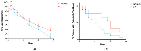 Mean viral load (copies/mL) and clearance. (a) The difference in mean viral load among all 45 controls, which included 11 LC and 34 non-LC patients, showed significance at enrollment (p = 0.01). (b) The viral clearance between all placebo LC and non-LC patients among all controls was not shown to be significant through the curve comparisons. * p < 0.05.