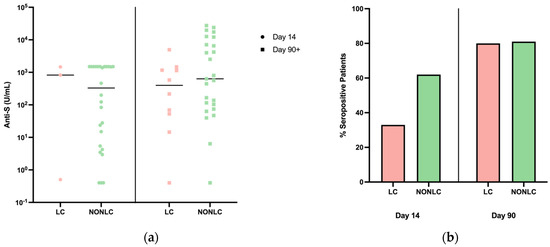 Clinically assayed anti-S serological data were available for 29/45 individuals at day 14 and 35/45 individuals at day 90. Anti-S titers in the LC and non-LC cohorts appeared relatively equal by day 90, with a difference of means ± standard error of the mean between timepoints of 2867 ± 2692. Anti-N data were available for 29/45 individuals at day 14 and 36/45 at day 90. Most patients were anti-N-reactive by day 90. Overall, there were no significant differences identified between cohorts in both anti-S and anti-N at both timepoints (Figure 3). This suggests that clinical serology may not be able to distinguish LC from non-LC patients.