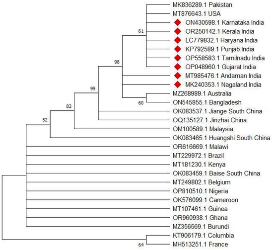 This gene is widely accepted for genetic characterizations and phylogenetic clustering of R. microplus [28]. COX1 has been used as a DNA marker in DNA barcoding [44] to portray and identify species. The superiority of the COX1 gene has already been shown in differentiating the R. microplus complex compared with other genes, like 12S, 16S, or the ITS2 region [17,18,23]. Phylogenetic analysis of the COX1gene of R. microplus from various countries revealed the prevalence of five distinct clusters, which include R. microplus clade A sensu (belonging to Africa, Asia, and South America), R. microplus clade B sensu (belonging to southern China and northern India) [17], R. microplus clade C sensu (belonging to Malaysia and India) [18], R. australis, and R. annulatus [17,18]. Phylogenetic analysis ofCOX1 using representative sequences from various countries revealed a similar pattern (Figure 1). For phylogenetic reconstruction, the sequences of COX1genes from different parts of the world were retrieved from the GenBank database and analyzed using MEGA-11. The best fit nucleotide substitution model was predicted using MEGA-11. A phylogenetic tree was constructed using the maximum likelihood method and a Tamura–Nei model using 1000 bootstrap replications to confirm the authenticity of the taxa analyzed for each node. A discrete Gamma distribution was used to model evolutionary rate differences among the sites.