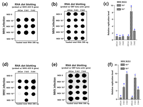 To this end, we infected DBT-3′shRNA cells (collectively designated as multiple DBT cells expressing shRNAs targeting the 3′UTR, Supplemental Table S2) with MHV-A59. Subsequently, total RNA was extracted from the aforementioned DBT-3′shRNA cells and subjected to an RNA dot blot assay. The results demonstrated that the shRNAs did not inhibit, but rather enhanced, MHV-A59 replication in the DBT cells (Figure 4a–d). In DBT-3′shRNA cells infected with M.O.I 10−3 MHV-A59, 3′sh1, 3′sh2, 3′sh3, and 3′sh4 demonstrated an 8.1-, 2.5-, 12.4-, and 5.5-fold increase in MHV-A59 replication, respectively, in comparison to the control (Figure 4c,f). Furthermore, DBT-3′sh3 and DBT-3′sh4 cells demonstrated elevated levels of viral replication following M.O.I 10−2 MHV-A59 infection, when compared to controls (Figure 4f).