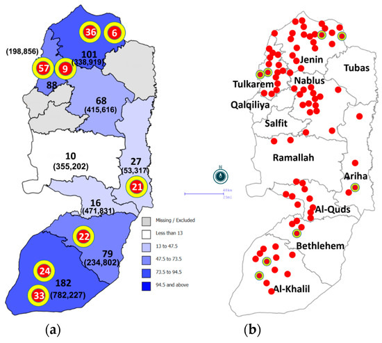 The choropleth, spot, and cluster mapping of COVID-19 cases from Palestine were constructed with statistical inference using the SaTScan™ v9.7 mapping package for the spatial scan statistics of case clustering and the Epi Info™ 7 statistical package (CDC free-software) for accurate mapping. SaTScan™ v9.7 Freeware was used to detect statistical evidence for purely spatial clustering of cases in the study area. The input files included the number of cases per locality, year of infection, population size of the location in the year of infection, and the exact latitude–longitude coordinates of each location. Data were analyzed based on the discrete Poisson model, using Monte Carlo hypothesis. The level of significance used was at p-value ≤ 0.05 [29].