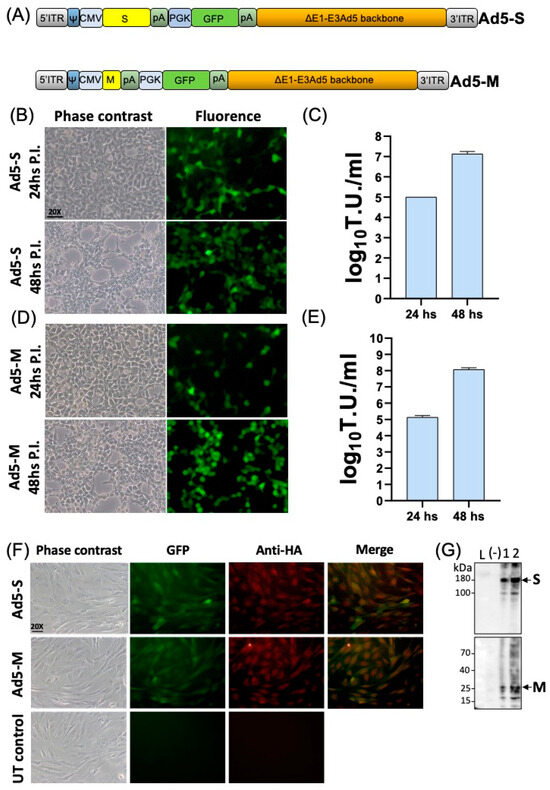 Replication-defective recombinant human adenoviruses type 5, Ad5-bocS-ΔRS-HA-GFP and Ad5-bovM-HA-GFP delivering BCoV S (bovS), and M glycoprotein (bovM) were constructed. Initially, an ORF encoding bovS was designed in silico. The bovS open reading frame (ORF) sequence, derived from a field isolate of the BCoV genome, was depleted of its last 19 bp, potentially coding for a potential endoplasmic reticulum retrieval signal (ERRS; peptide: CCDDYTGHQELVIKTSHDD), and substituted with a hemagglutinin (HA) tag to be monitored in terms of expression via Western immunoblotting. The so-designed ORF, bovS-ΔRS-HA, was human codon usage-adapted with the Jcat codon adaptation tool (http://www.jcat.de (accessed on 1 June 2023)) and chemically synthesized. Similarly, bovM ORF was human codon usage-adapted, HA-tagged to its carboxyterminal (M-HA), and chemically synthesized as for bovS-ΔRS-HA (sequences in Figures S1 and S2). Next, each of the two ORFs was integrated into a replicating incompetent type-5 Adeno viral-transfer vector (Ad5) backbone under the control of the CMV immediate early promoter and a bovine growth hormone polyadenylation signal. A GFP expression cassette, to follow viral replication and transduction, was provided, too (Figure 1A). Recombinant Ad5-bovS-ΔRS-HA-GFP and Ad5-bovM-HA-GFP infectious viral particles were reconstituted in HEK293T cells, as shown in their replication competence inducing progressive CPE (Figure 1B,D) and the increase in the viral titer during the post-transfection time (Figure 1C,E). Whereas transducing competence, as well as replication incompetence, was evaluated using ovine cells defective in E1A and E1B genes, in fact, these cells were well transduced in the absence of CPE, as shown in the GFP, bovS, and bovM expression (Figure 1F,G).