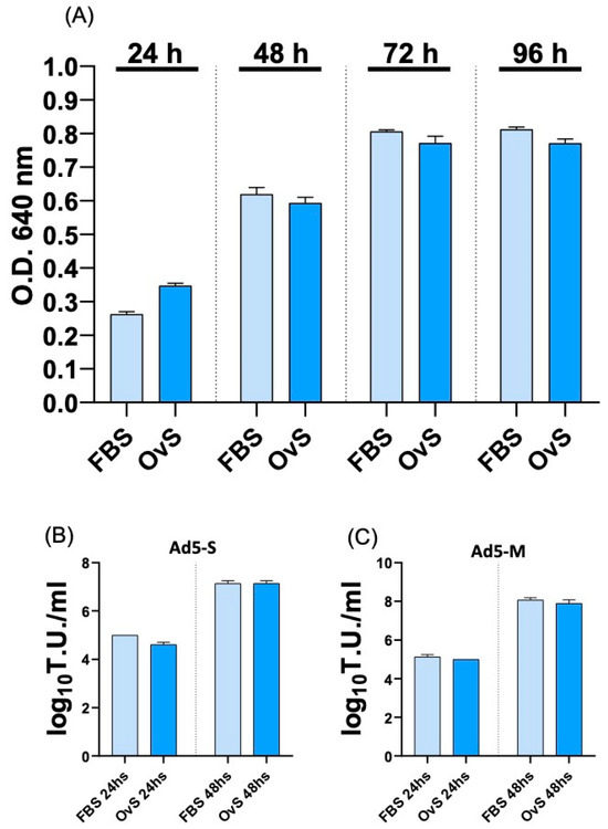Assessment of HEK293T growth in OvS. MTT assay comparing HEK293T growth with medium containing 10% of FBS and the same number of HEK293T growth with medium containing 10% of OvS at different time points (24, 48, 72, and 96 h); absolute values are expressed as optical density (O.D.) (A) The data presented are the means ± standard errors of triplicate measurements (p > 0.05, as measured with Student’s t test). (B,C) Ad5-S and Ad5-M titer was measured and compared between cells’ growth with FBS or OvS at 24 and 48 h post-infection and expressed as log10 T.U. per mL of viral particles released. Values are the means ± standard errors of three independent experiments.