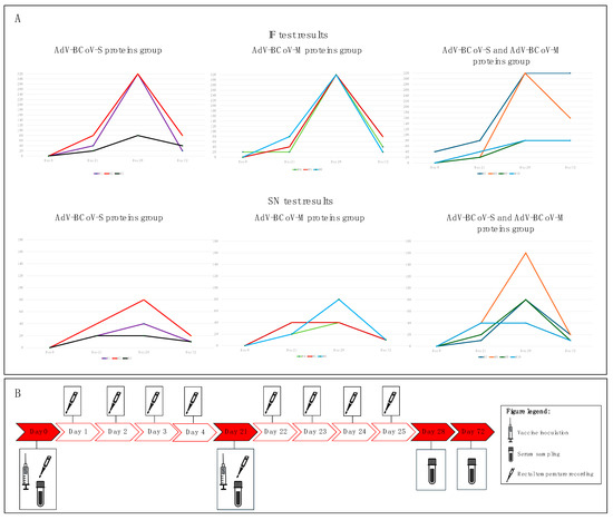 Monitoring of immune response in the AdV-BCoV-S protein group, AdV-BCoV-M protein group, and AdV-BCoV-S + M proteins group using IF test and SN test. In the plots, the x-axis represents the time point (days) in which the antibody titer was evaluated, while the y-axis represents the antibody titer expressed as an absolute value. (A): The antibody titer detected in each animal of the three groups included in the experiment using IF and SN at four checkpoints (day 0, day 21, day 28, and day 72). (B): Timeline of the procedure conducted during the experiment.