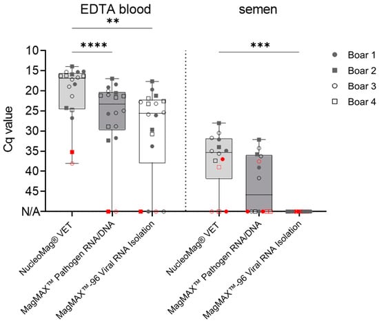 3.2. Extraction Efficiency Evaluation of the ASFV Genome from Boar Semen