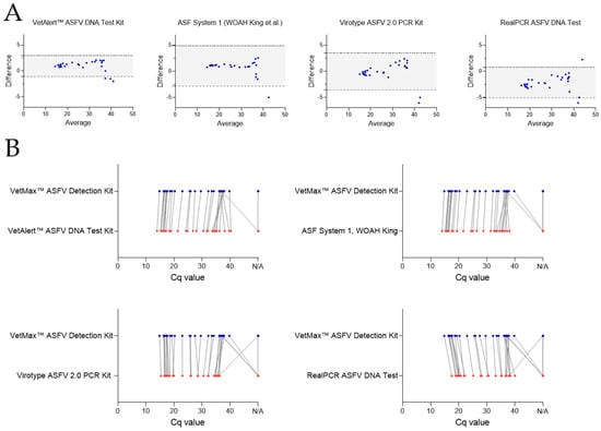 - Pikalo, J.; Carrau, T.; Deutschmann, P.; Fischer, M.; Schlottau, K.; Beer, M.; Blome, S. Performance Characteristics of Real-Time PCRs for African Swine Fever Virus Genome Detection-Comparison of Twelve Kits to an OIE-Recommended Method. Viruses 2022, 14, 220. [Google Scholar] [CrossRef]