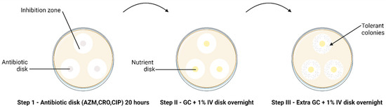 The modified TD test was carried out according to Balduck et al., 2022 [11]. This test comprises a three-step incubation process. In brief, the direct colony suspension method was used to prepare the inoculum [16], wherein a small quantity of inoculum from an overnight subculture on chocolate agar was suspended in phosphate buffer saline (PBS). The turbidity of the suspension was adjusted to 0.5–1.0 to the McFarland (McF) standard and inoculated on BDTM GC agar plates. Three disks with the respective antibiotics (AZM 0.75 µg/mL, CRO 0.064 µg/mL, CIP 0.032 µg/mL) were placed on each plate inoculated with the strains. Antibiotic disks were created by soaking 6 mm blank disks (Merck Life Science, Darmstadt, Germany) in 25 µL of the required antibiotic, and the antibiotic concentration was calculated to fall below the MIC. After approximately 20 to 24 h of incubation at 36° C and 6.0% CO2 (Step I TD test), the antibiotic disks were removed and replaced by 6 mm blank disks containing 25 µL gonococcal broth (distilled water supplemented with 15 g/L bacto protease peptone no 3, 1 g/L soluble starch, 4 g/L K2HPO4 (174.18 g/mol), 1 g/L KH2PO4 (136.08 g/mol), 5 g/L NaCl (58.44 g/mol) and 1% BD BBLTM IsoVitaleX). The plates were again incubated overnight (Step II TD test). This was followed by adding 10 µL of GC medium onto the same nutrient disk. The plates were incubated for another night (Step III TD test) (Figure 1).
