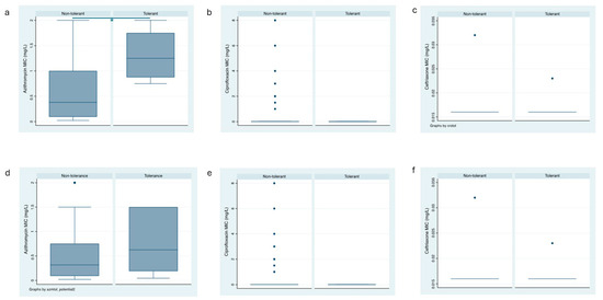 Box plots of the azithromycin, ceftriaxone and ciprofloxacin MICs of the tolerant and non-tolerant isolates (a–c) and the potentially tolerant and non-tolerant isolates (d–f); box represents median [line] and interquartile ranges, whiskers the 95% CI).