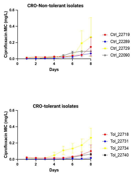 3.5. Induction of Resistance to Ciprofloxacin in CRO-Tolerant Isolates
