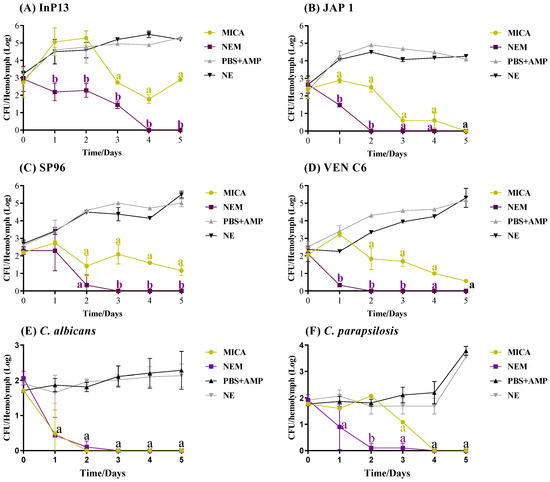 The results of the antifungal activity of MICA and NEM in the hemolymph are shown in Figure 4A–F. Both treatments were statistically significant (p = 0.05, p < 0.0001), reducing the fungal load in hemolymph compared to the infection group (NE and PBS+AmP). When comparing the treatment options, NEM showed superior antifungal activity against all strains tested, except for C. albicans (Figure 4E), where both treatments were similar. NEM completely inhibited the fungal load in hemolymph after 2, 3, and 4 days of treatment in G. mellonella infected with JAP 1, VEN C6, SP96, C. albicans, InP13, and C. parapsilosis (p < 0.0001). However, despite the significant results, the infection persisted in the groups treated with MICA. Complete inhibition of the fungal load was achieved only in the group infected with C. albicans, C. parapsilosis, and JAP 1 after 3, 4, and 5 days of treatment, respectively. This represents only 50% of the strains (25% for C. auris), as shown in Figure 4B,E,F. There is a clear difference between the strains of C. auris, especially on the second day; e.g., on the second day, the fungal load in of hemolymph for the group treated with MICA and NEM was 105 and 102 CFC/mL for InP13 (p = 0.029), 102 and 0 CFC/mL for JAP 1 (p = 0.028), 101.4 and 100.3 CFC/mL for SP96 (p < 0.0001), and 101.8 and 0 CFC/mL for VEN C6 (p < 0.0001), respectively.
