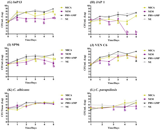Antifungal activity of MICA and NEM against C. auris and non-C. auris in G. mellonella hemolymph and tissues. (A–F): Hemolymph; (G–L): tissue; NE: nanoemulsion; PBS+AmP: basic phosphate solution + ampicillin (20 µg/mL); MICA: micafungin; NEM: nanoemulsion + micafungin; absence of letters: no statistical difference; letter (a): the difference between infection groups (NE and PBS+AmP) with treated groups (MICA and NEM); letter (b): difference with the infection group and difference with MICA.