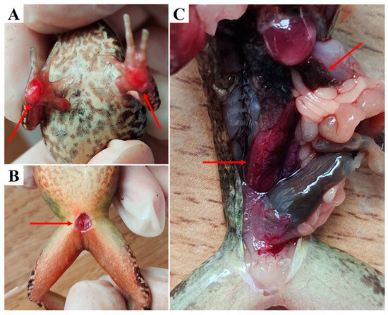 Clinical signs in diseased R. dybowskii. (A) Skin ulceration of the forelimbs, revealing corroded muscles. (B) Abdominal skin was broken and muscles are congested. (C) The kidney and spleen were congested and swollen.