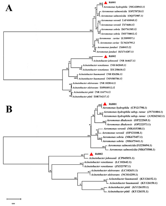 The 16S rRNA gene sequences of Rd001 and Rd002 obtained by PCR amplification have been uploaded at NCBI with GenBank accession numbers PP094559.1 and PP658225, respectively. BLAST results showed that isolate Rd001 shares 100% identity with the A. hydrophila (MG428943.1), and isolate Rd002 shares 99.7% identity with the A. johnsonii (NR164627.1). The gyrB gene sequences of Rd001 and Rd002 obtained by PCR amplification have been uploaded at NCBI with GenBank accession numbers PP894756 and PP894757, respectively. BLAST results showed that isolate Rd001 shares 100% identity with the A. hydrophila (CP121798.1) and isolate Rd002 shares 97.8% identity with the A. johnsonii (CP045051.1). Based on the phylogenetic trees constructed using the 16S rRNA and gyrB genes sequences (Figure 2), isolate Rd001 was grouped with recognised strains of A. hydrophila, while Rd002 was associated with A. johnsonii. The results of BLAST and phylogenetic analysis confirmed that Rd001 is A. hydrophila and Rd002 is A. johnsonii.