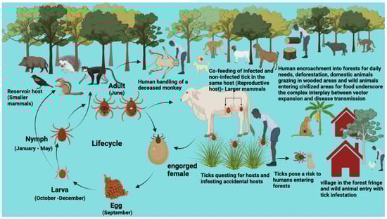 Ticks, mammals, and birds maintain the KFD virus through cycles. Monkeys, particularly Macaca radiata (bonnet macaque) and langurs in the genus Semnopithecus, are susceptible and often fatal hosts, yet they serve as important reservoirs. Cattle, the primary hosts for the ticks, do not amplify the virus, and their role in KFD transmission requires further investigation [227,228]. Tick species such as Haemaphysalis turturis, Haemaphysalis kinneari, Haemaphysalis kyasanurensis, Haemaphysalis wellingtoni, Haemaphysalis minuta, Haemaphysalis cuspidata, Ixodes petauristae, Ixodes sceylonensis, Dermacentor auratus, and Rhipicephalus haemaphysaloides have been reported in eleven out of 29 states and 7 union territories in India, and they are capable of carrying the virus [45,229].