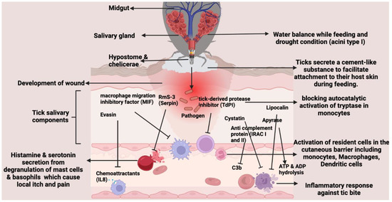 A comprehensive depiction of a tick bite is presented, elucidating the intricate process through which the tick injects various components into its host. The visual narrative highlights the molecular and biochemical aspects of the tick–host interaction, unveiling the complexity inherent in this parasitic relationship. (Illustration created by using BioRender.com).
