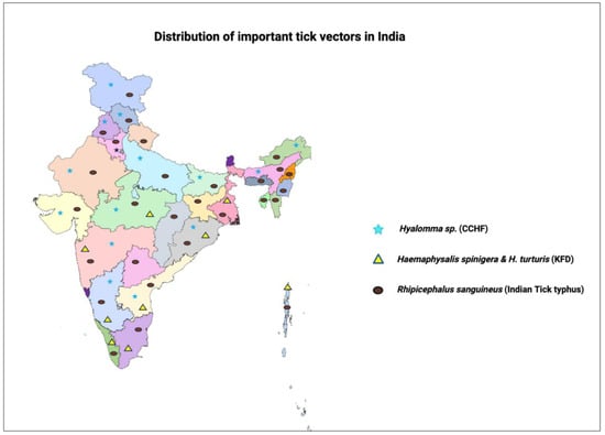 Over the years, our knowledge of ticks in India has evolved through various contributions, including those of [156,157,158,159]. The compilation by the National Institute of Virology and other institutes includes 106 valid tick species collected from different hosts across the country [160].